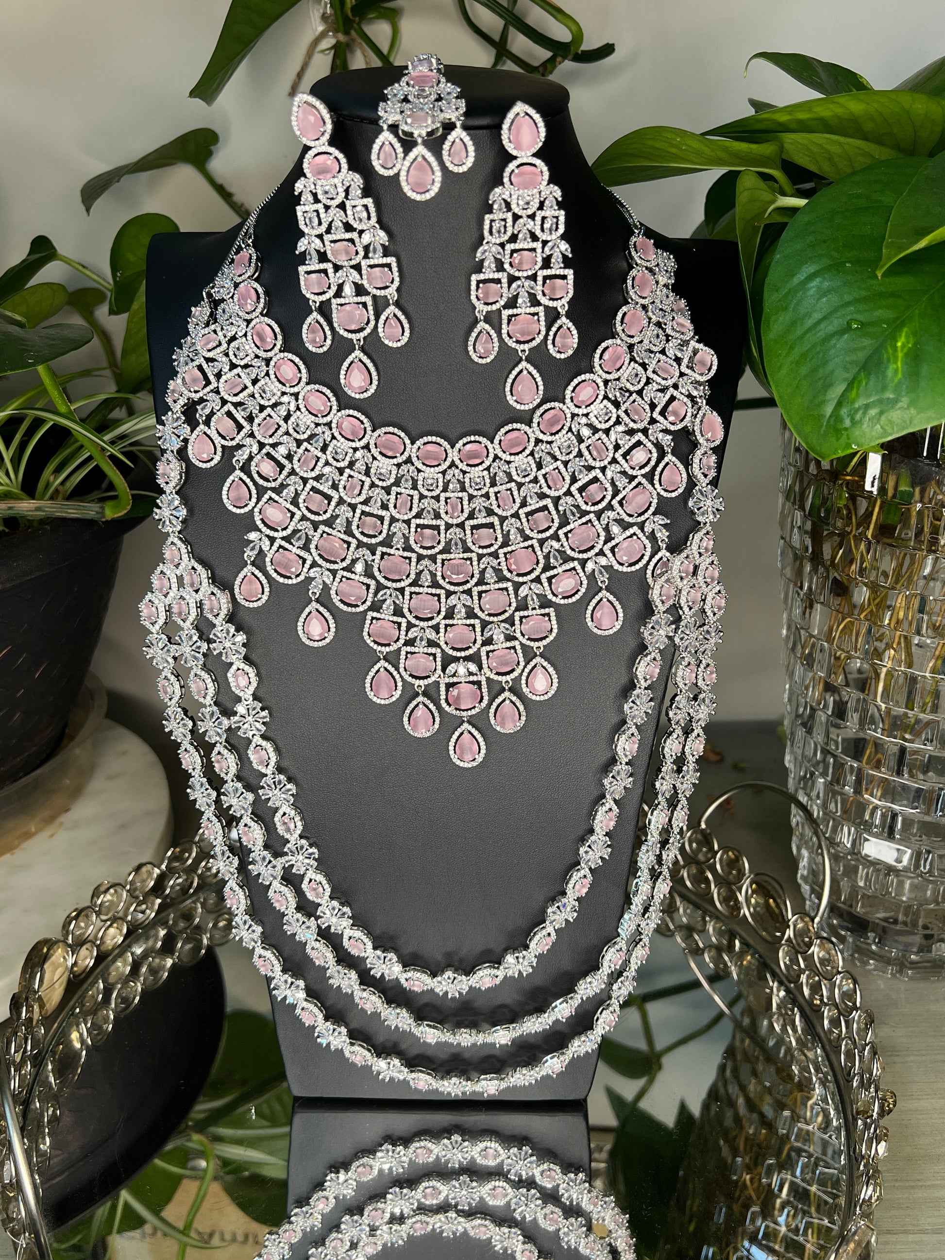 Introducing our stunning collection of AD statement necklaces with pastel pink stones and dangler earrings - the epitome of sophistication and glamour. Each necklace boasts a diamond-like shine that will leave you breathless. This set also includes an additional mang tikka, so you can complete your bridal look effortlessly.