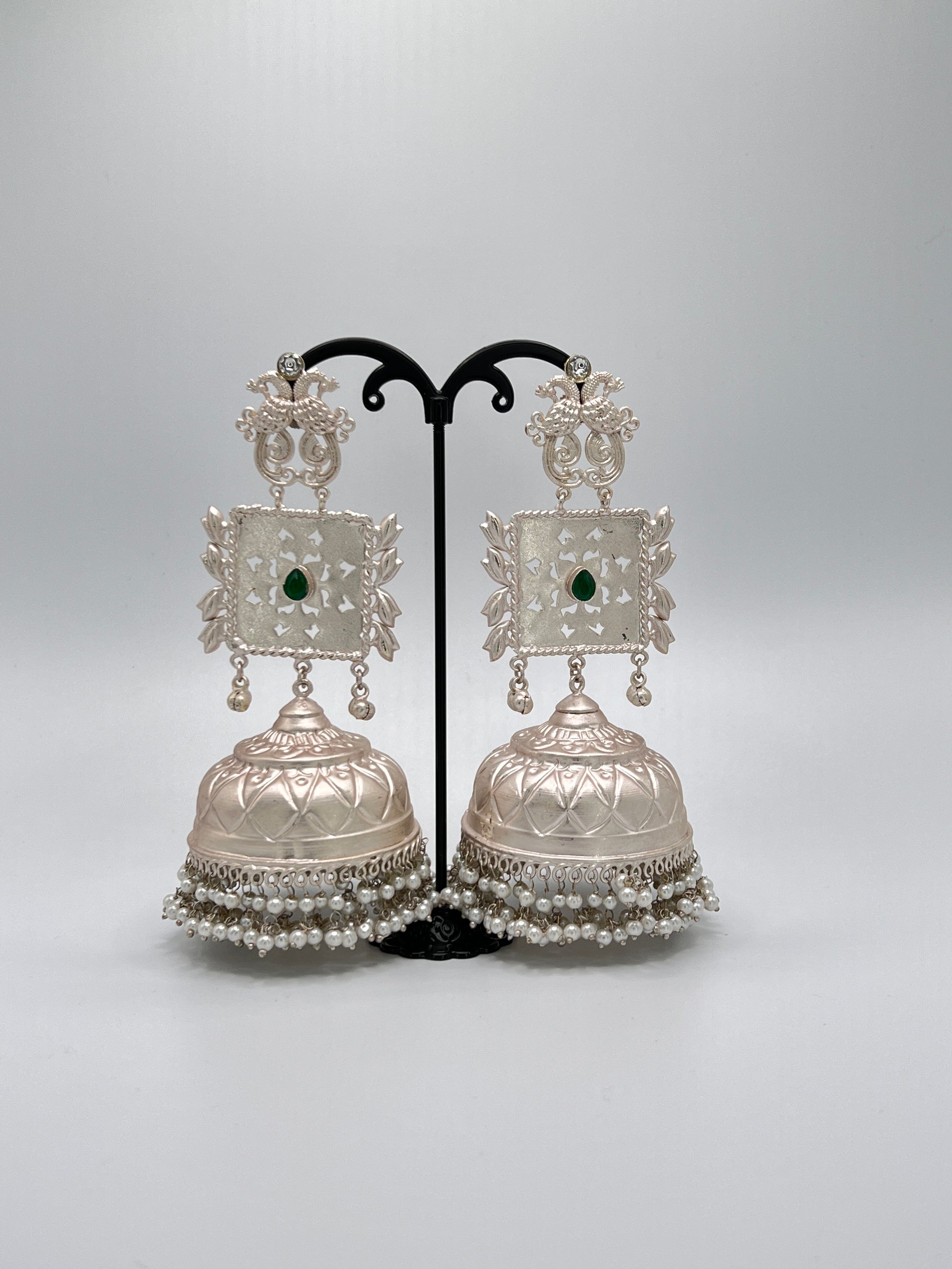 Make a statement with these stunning silver large statement earrings. Lightweight and comfortable to wear, these earrings exude elegance and sophistication. The classic and royal design with a center Green Kundan Stone will elevate any outfit and add a touch of sophistication to your style. Perfect for special occasions or to add some sparkle to your everyday look, these earrings are a must-have addition to your jewelry collection.
